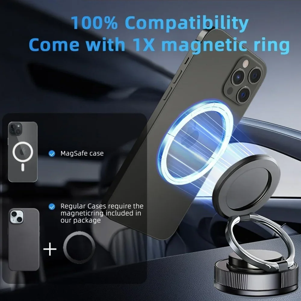 【Wide Compatibility】360° rotatable mobile phone car holder comes with flexibility and adjustable space.Strong vacuum suction magnetic phone holder is universal and works well with all kinds of brands smartphones models. Besides, we also offer a magnetic metal ring for non-magnetic phones and cases which meet your multiple needs. (Note: When using it on dashboard,leather material,wooden or other rough surfaces, pls apply the plastic adhesive pad offered to strengthen the suction)
